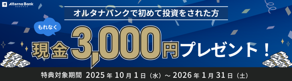 | オルタナバンク | クラウドファンディング | 最大3,000円現金 | 初回投資 | 詳細を見る | |
